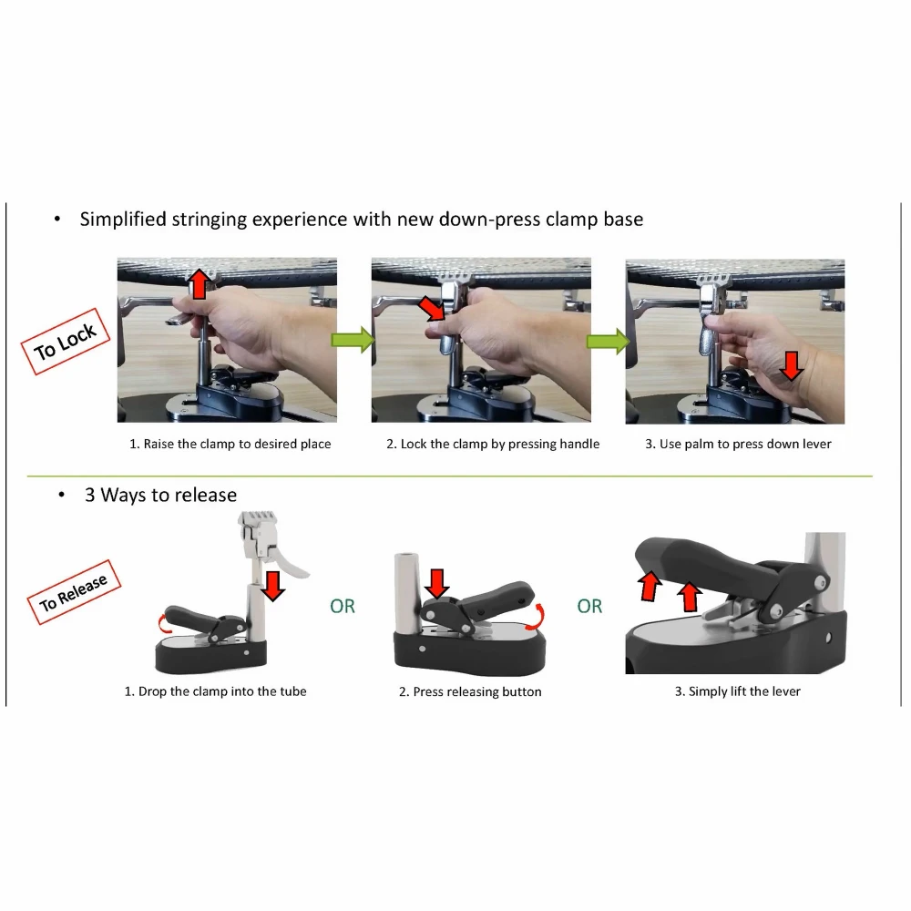 The 700 ES Features Patented Time Saving Down-Press Clamps and Gravity Assisted Release. Simply press the base lever down and it locks. To release, the clams are gravity assisted, or you can pull up on the base lever. Either way its lightning fast and super easy to use. Clamps are CMC molded and compact and space saving so you can maneuver into the tiniest corners to clamp the string. These clamps are finely adjustable to comfortably clamp any string. The clamps are universal to both tennis and badminton.